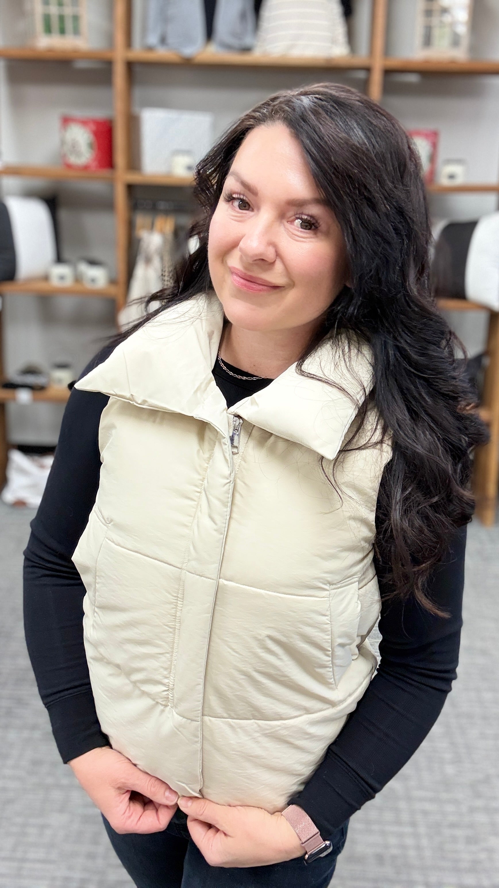 Enjoy layering for warmth or fashion with this beige puffer vest. Vest hits at the waist, has zipper closure and pockets. Sizing runs small so size up for a perfect fit.