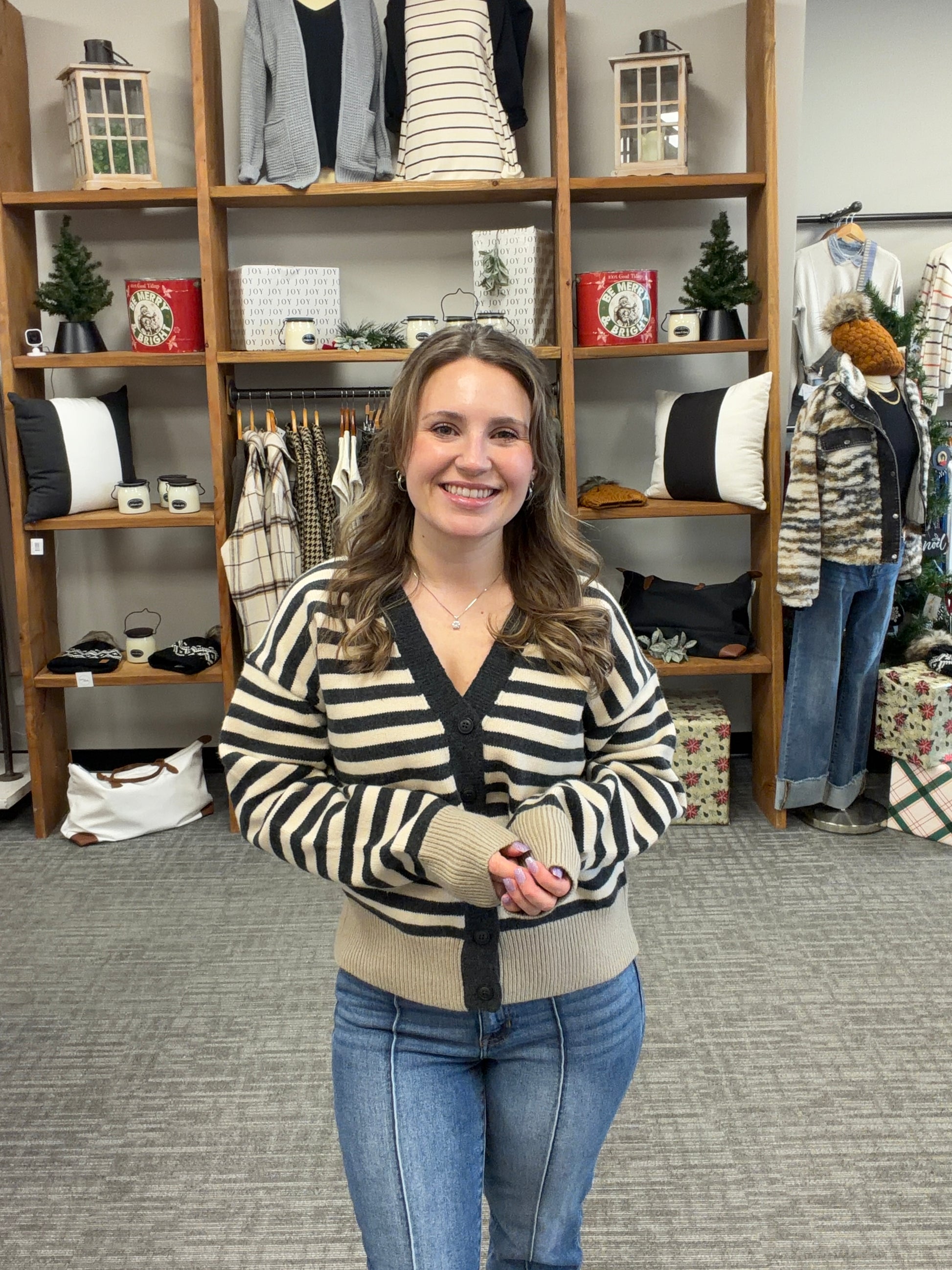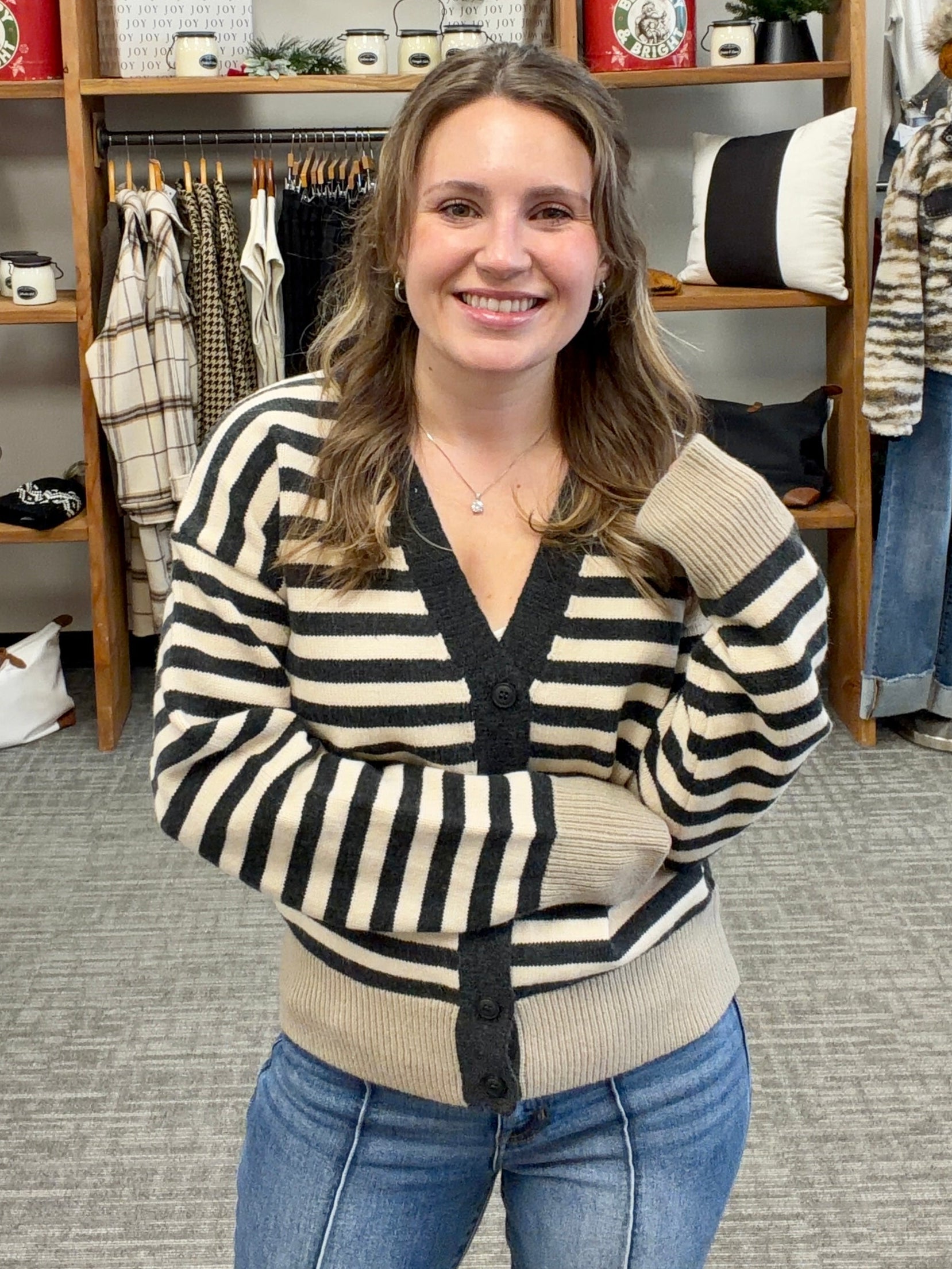 Charcoal and light tan striped cardigan. 39% Acrylic 31% Polyester 30% Nylon