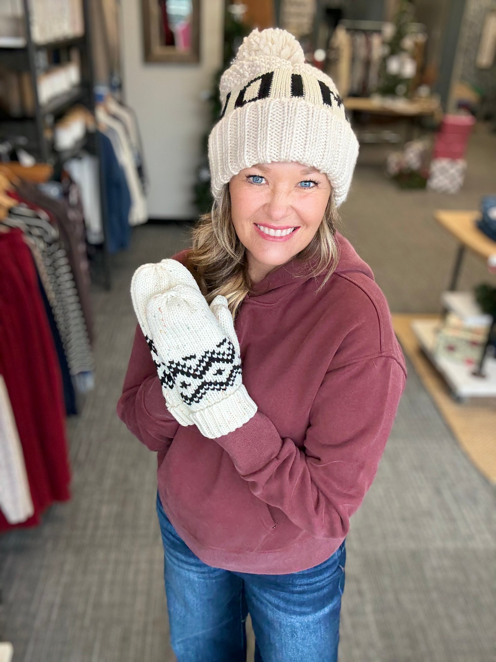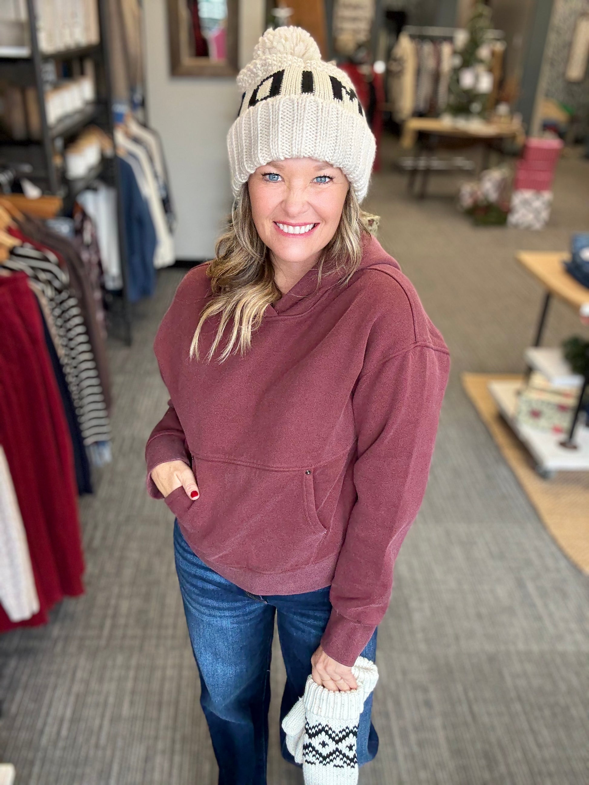 Burgundy hoodie in a soft brushed fabric. Kangaroo pocket with grommet trim. Hood is lined.