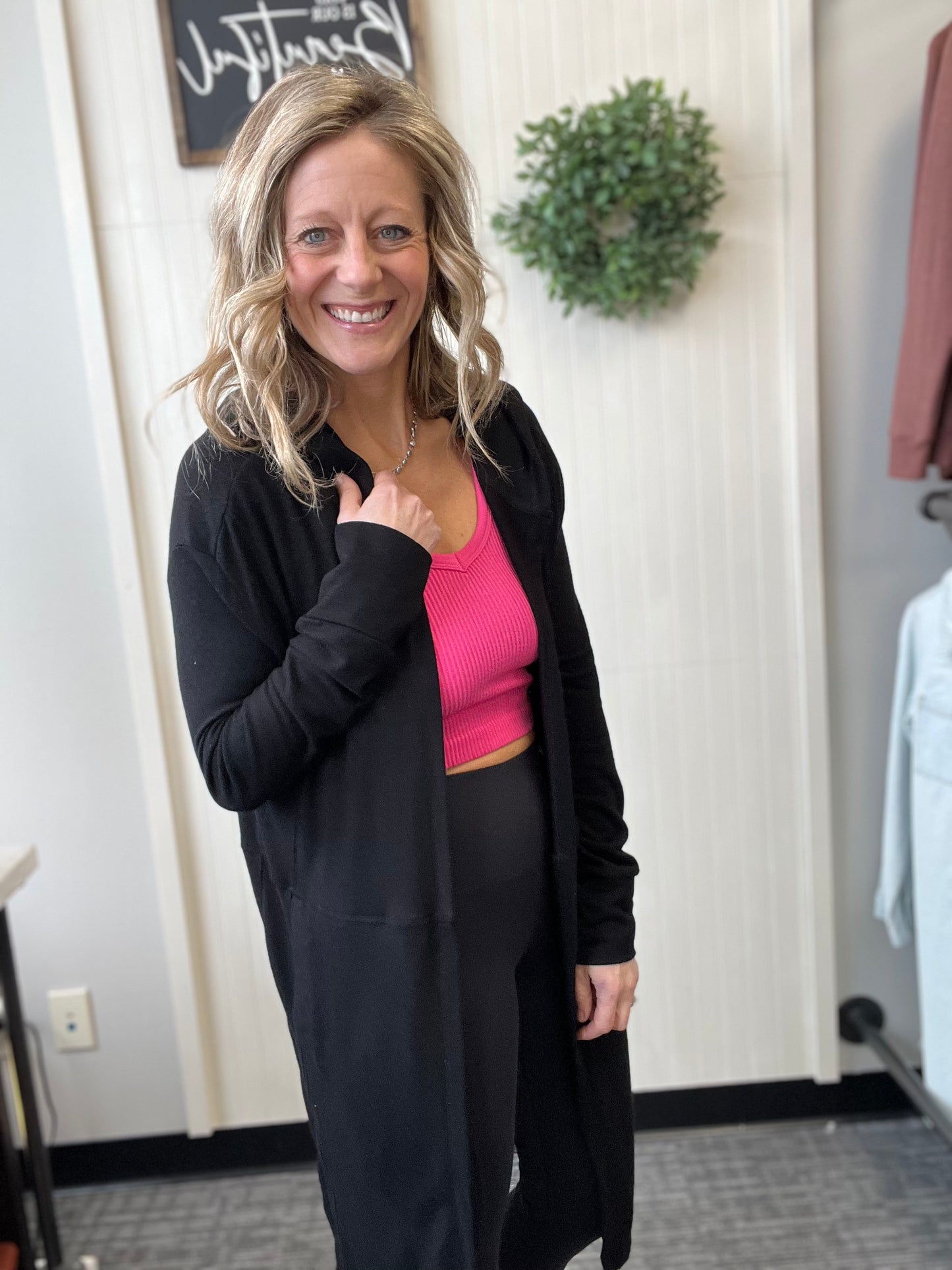 Long, open front hooded cardigan with pockets.