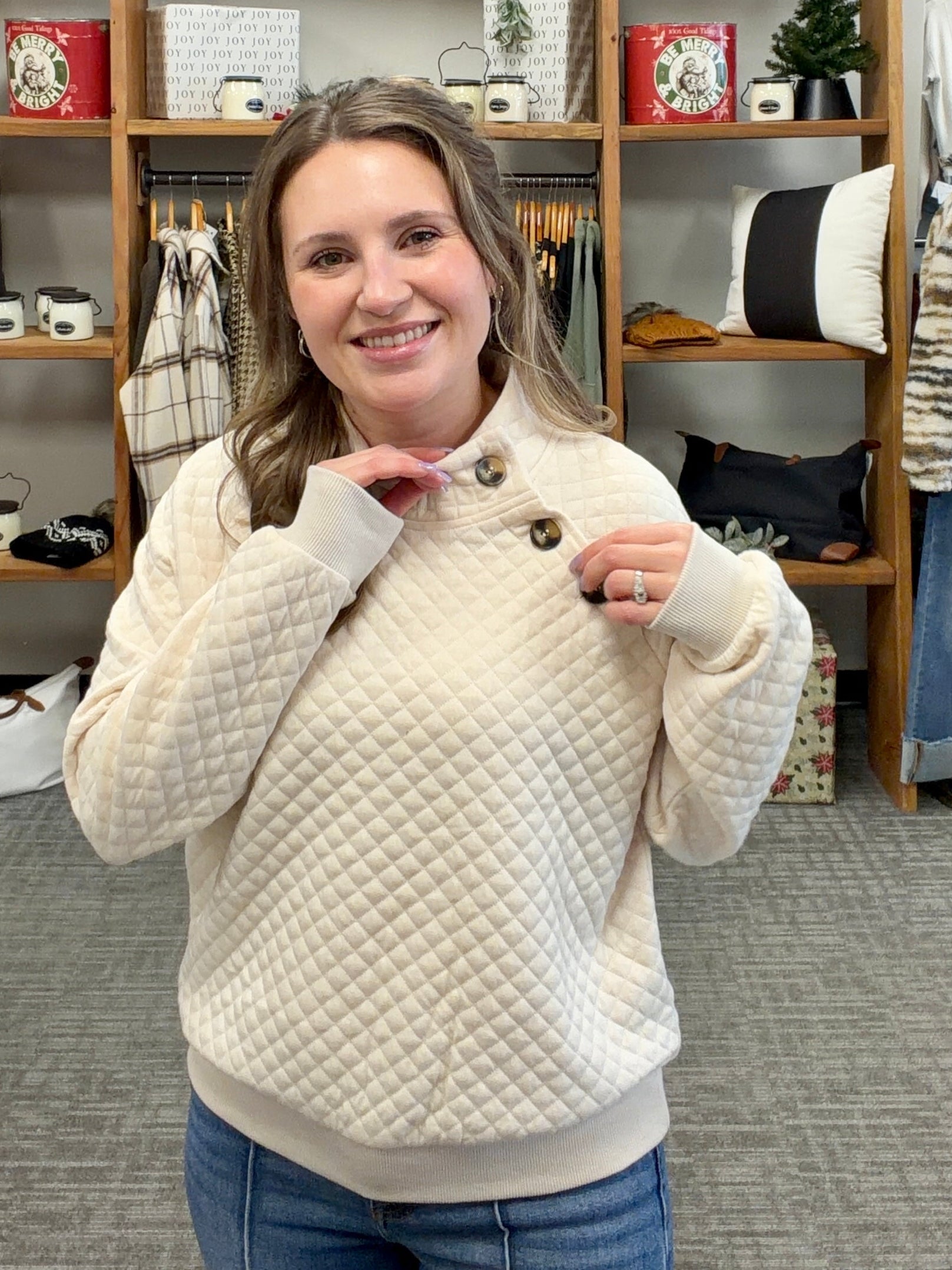 Ivory Quilted Sweatshirt with Mock Neck. Mock Neck has 3 Button Detail on Right Side of Neck. 96% Polyester 4% Spandex