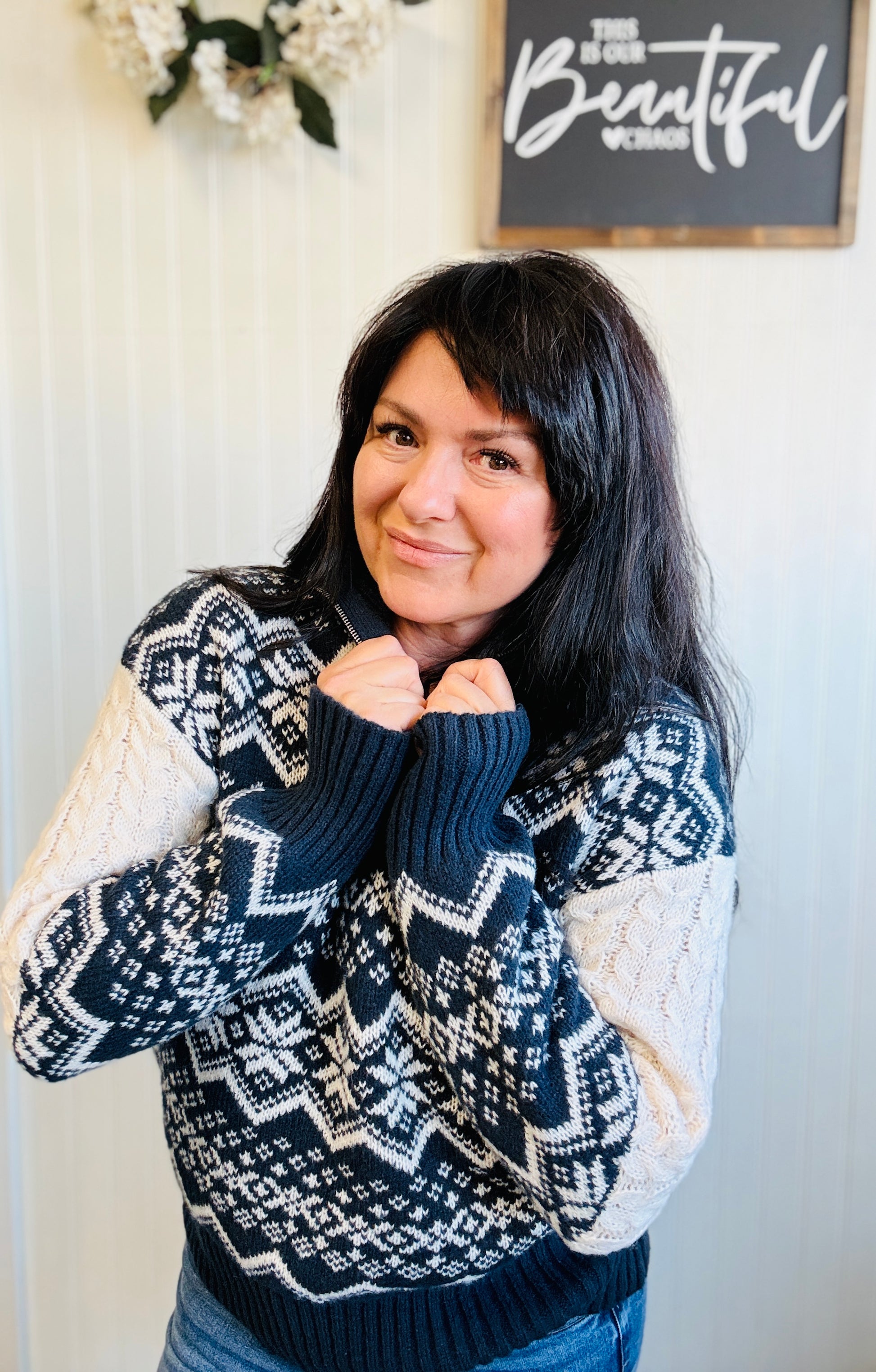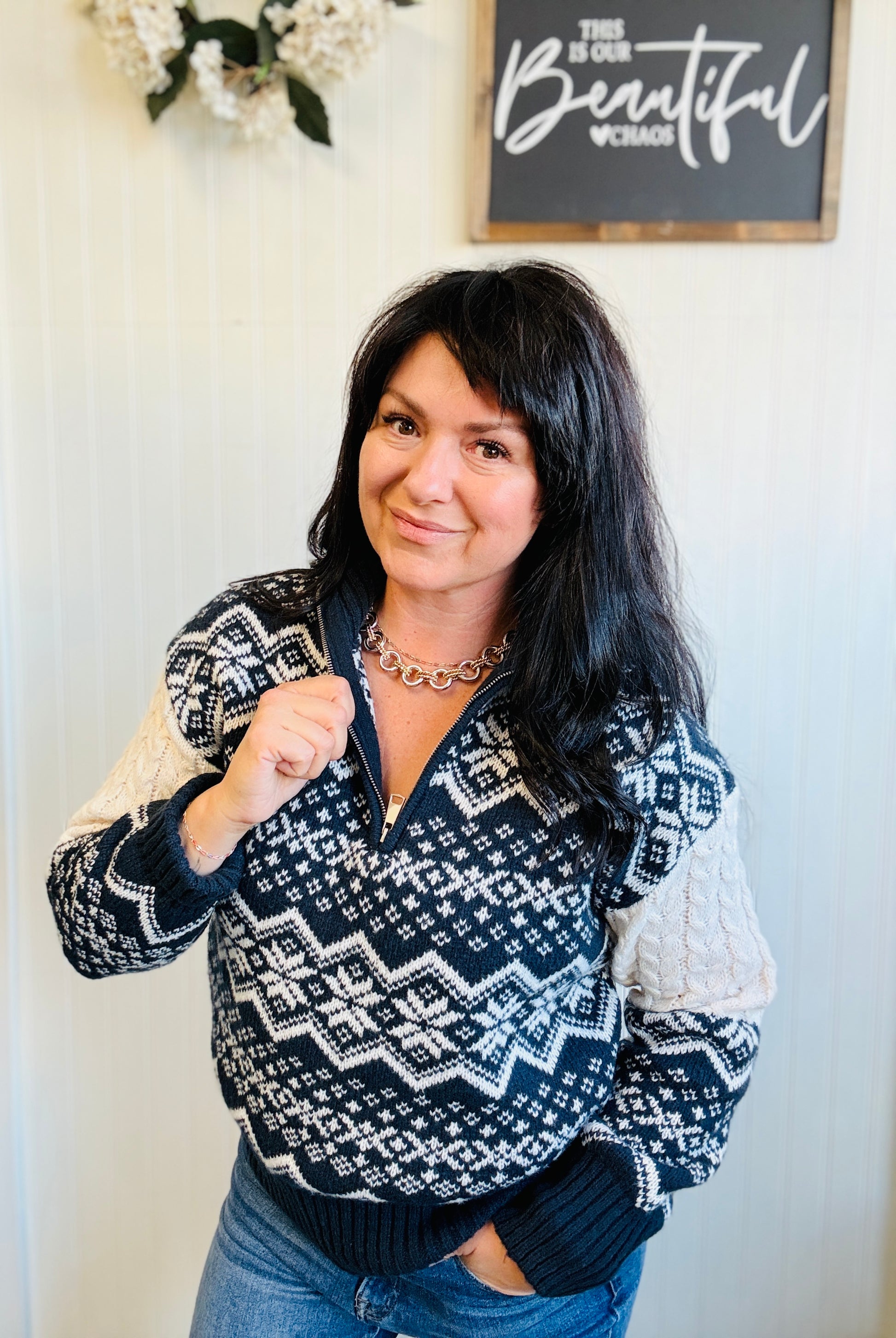 Navy and cream half zip sweater with argyle patter. Cream cable knit on upper sleeves.