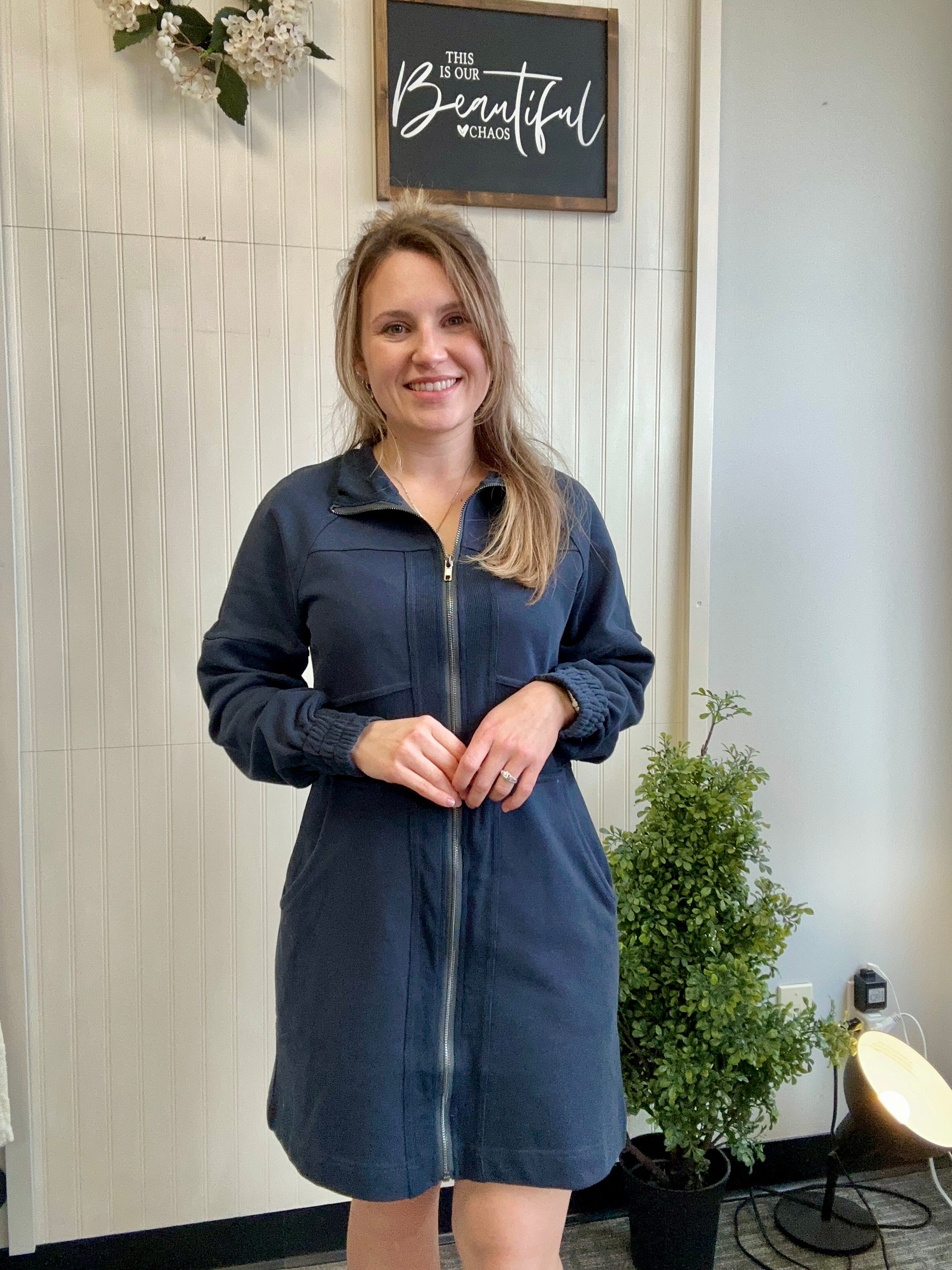 This fun sporty mini dress in Navy has a funnel neck with zip up closure and pockets.
