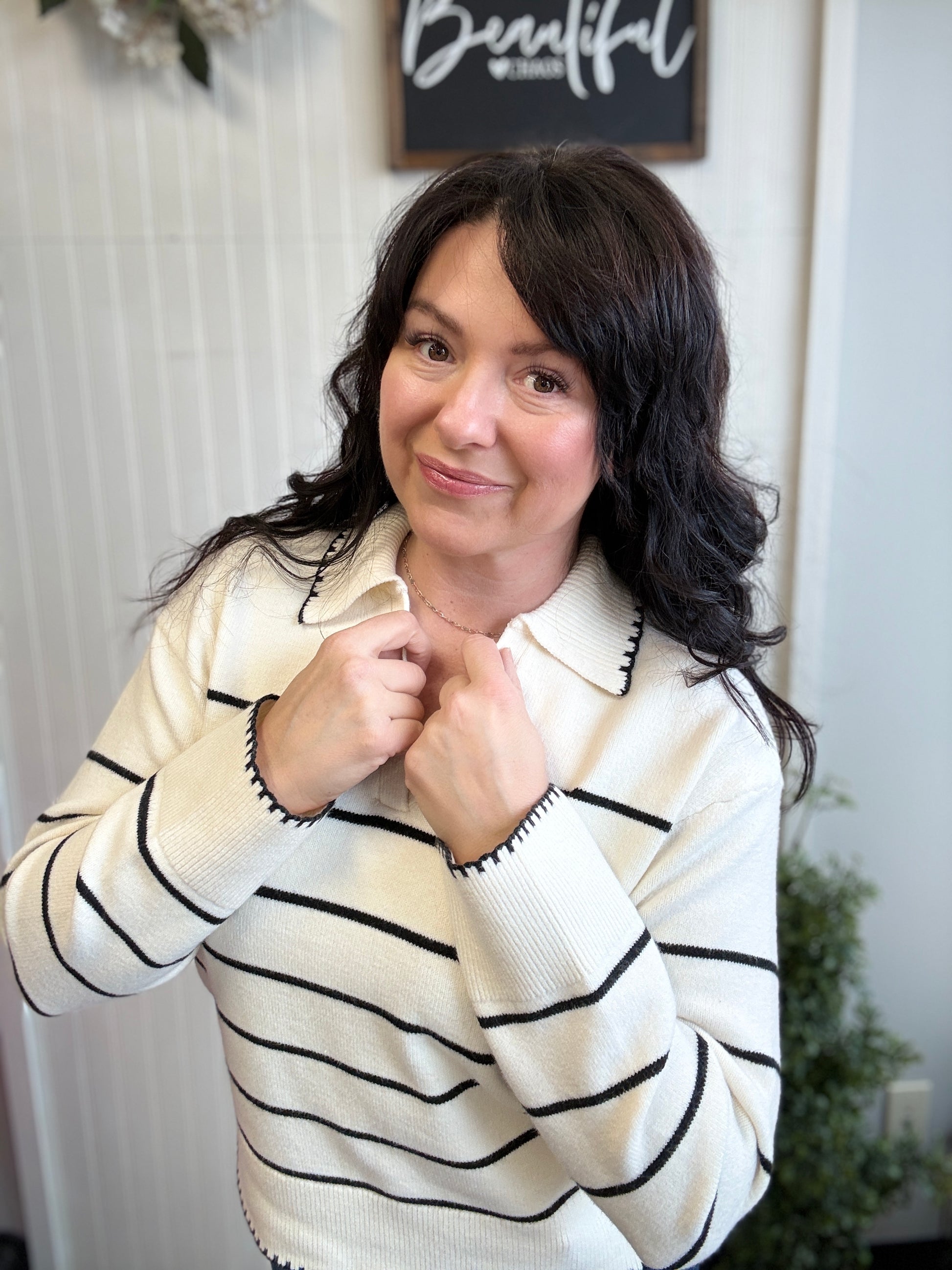 Cream colored sweater with a V neck. Ribbed collar, cuffs and hemline trimmed in a black blanket stitch. Horizontal black stripes.