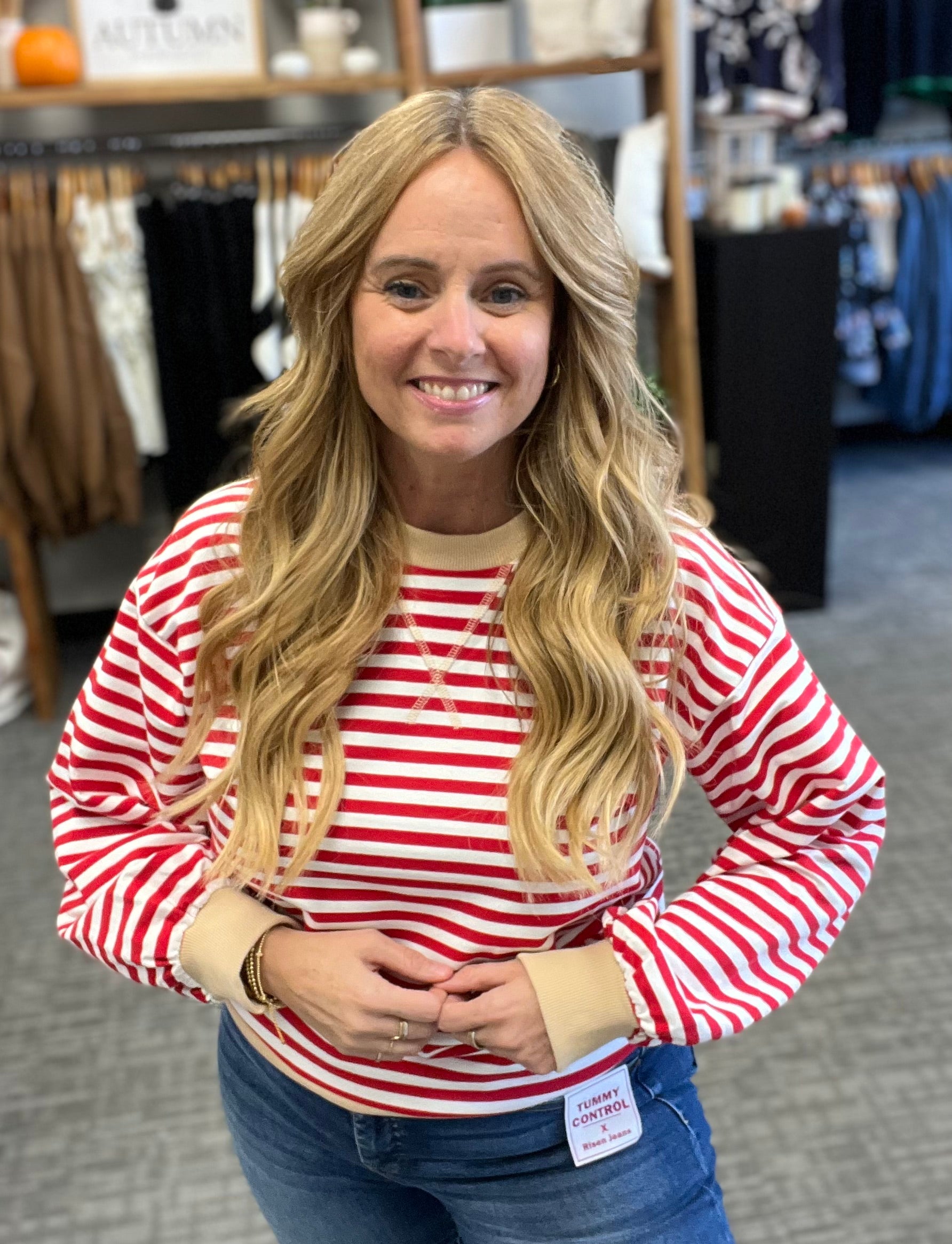 Red and Ivory Striped Long Sleeve Crew Neck Shirt. Tan Collar and Cuff Sleeve. 95% Cotton and 5% Spandex.