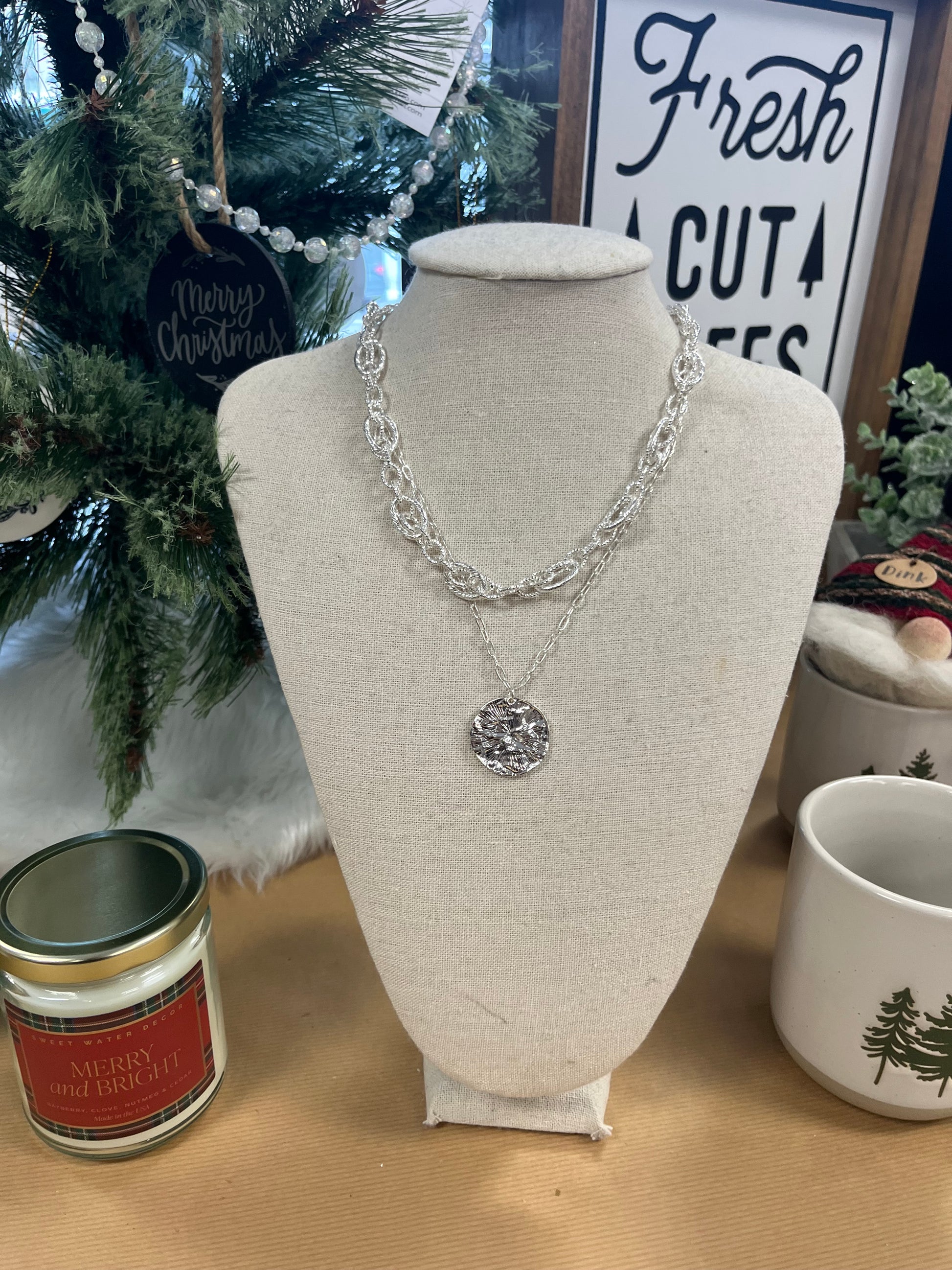 Water Resistant Layered Silver Chain with Hammered Silver Coin 16-18" Necklace